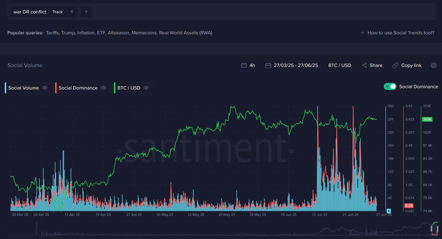 The past week’s events — from US airstrikes on Iran’s nuclear sites to Iran’s missile response and the shaky ceasefire that followed — have stirred global fears of another major war. But for the crypto market, this is familiar territory. As we’ve seen during the Russia-Ukraine war and the Israel-Palestine conflict, price dips caused by war headlines are often short-lived. Large investors tend to buy when retail traders panic, leading to market rebounds that punish those who gave in too quickly to fear. The latest war scare may follow that same script, especially now that a ceasefire is in place and immediate violence appears to be cooling.