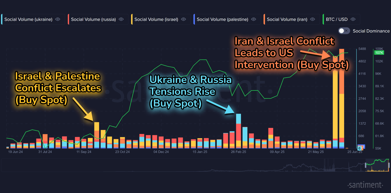 Back in February 2022 when the Russia-Ukraine war began, crypto prices plunged at first. But within days, the market bounced back stronger, leaving behind those who panic sold in fear. Similarly, October 2024 saw initial sell-offs after the Israel-Palestine conflict’s presence escalated in the mainstream media. However, just as we’re seeing now, prices dropped sharply as war headlines flooded social media … and then quickly reversed when the crowd turned overly fearful. As of the time of this writing, this latest conflict has looked like a classic case of markets moving opposite to what the crowd expects, and has been even more punishing to panicking traders when Iran and Israel called a truce.