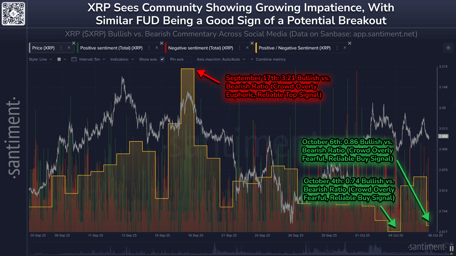 ๐ฎ XRP is seeing it's highest level of retail FUD since Trump's tariffs were announced 6 months ago. There have been more bearish comments than bullish for 2 of the past 3 days, which is generally a promising buy signal. Markets move opposite to small trader expectations.