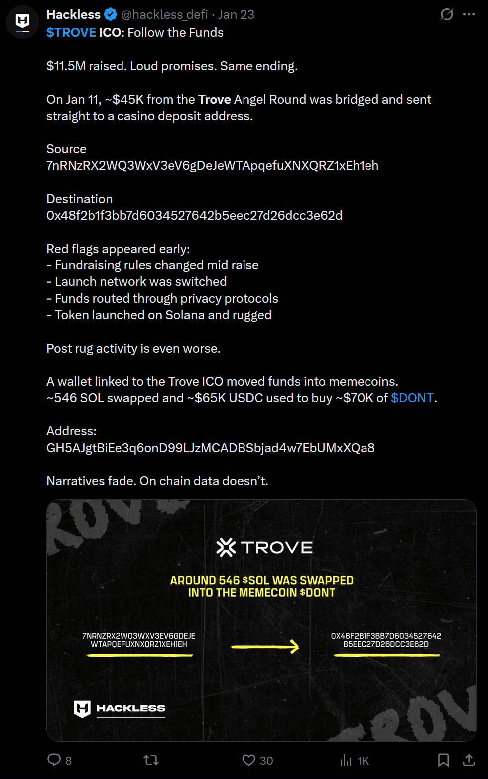On-chain investigators quickly began tracing where portions of the raise actually went. According to blockchain security firm Hackless, a wallet tied to the Trove angel round bridged funds and routed roughly $45K to an address associated with a casino deposit shortly after the raise. Their analysis also highlighted multiple early warning signs: fundraising terms changed mid-raise, the launch network was switched, and funds were reportedly passed through privacy rails before the token ultimately launched and collapsed on Solana. While the team never publicly confirmed these movements, the transparency of blockchain records fueled immediate skepticism about intent.