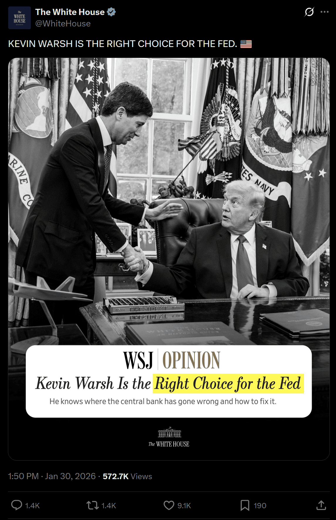 Post from @TheWhiteHouse supporting Trump's nomination of Kevin Warsh. Source: X