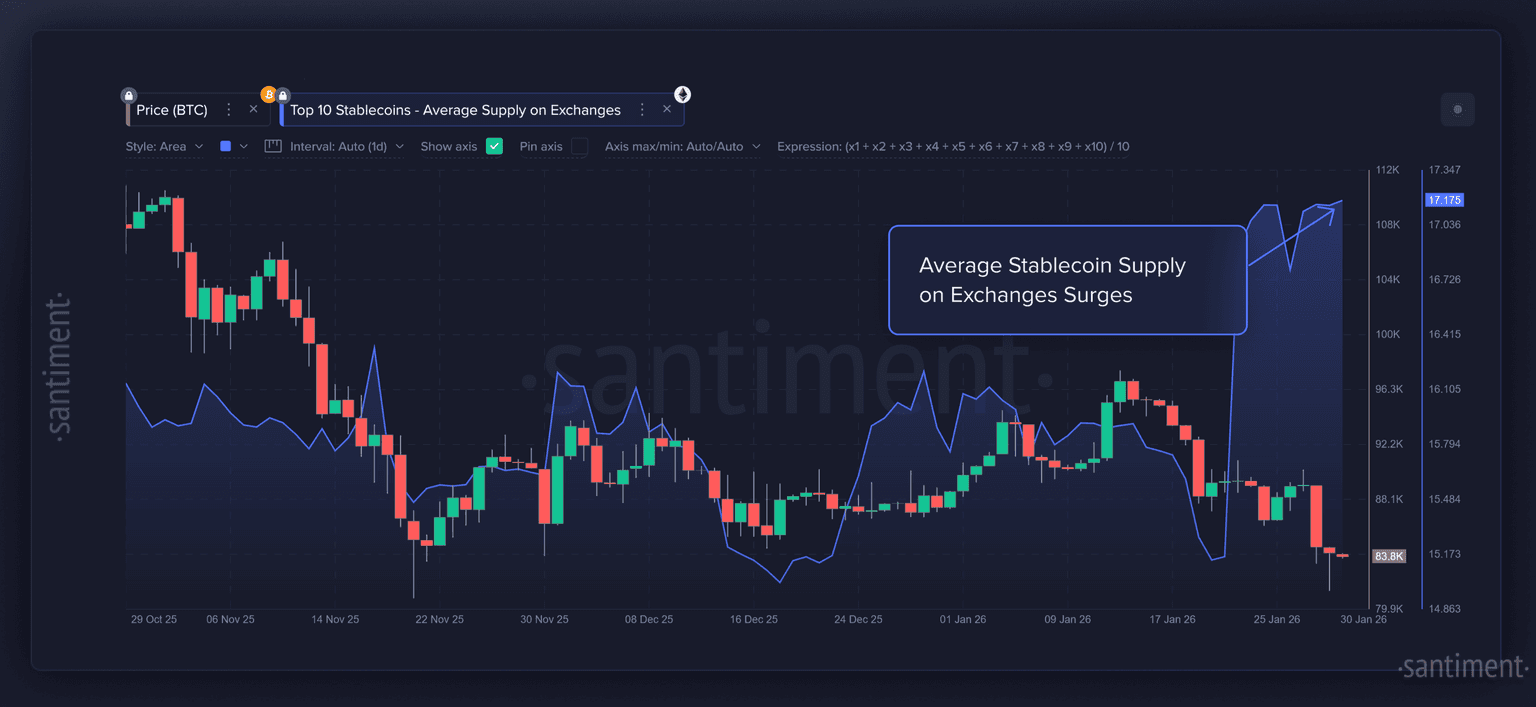 Average supply on exchanges among the 10 largest stablecoins in crypto. Source: Santiment