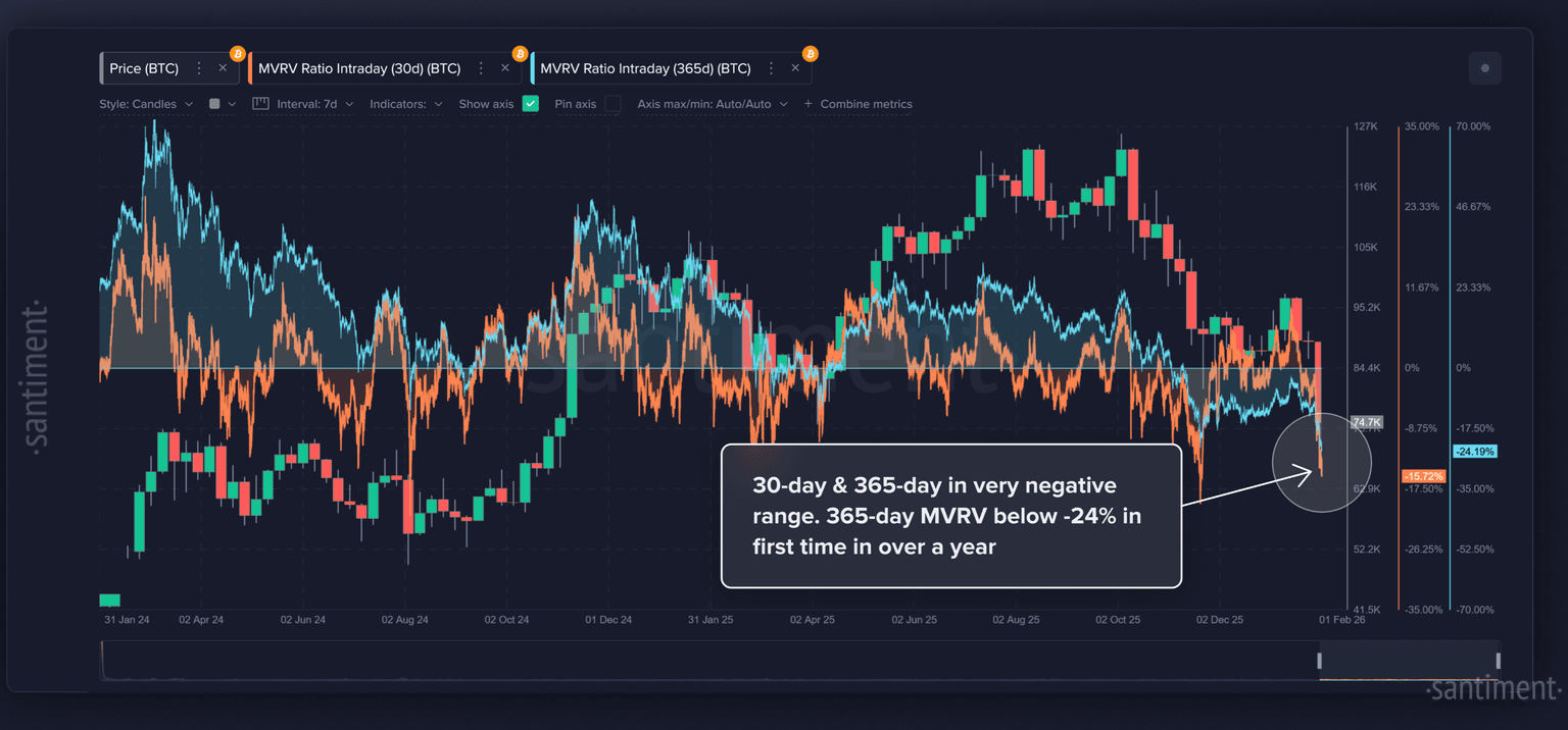It’s hard to believe it’s been just under four months since Bitcoin’s $126K all-time high was being celebrated across public social media and private messaging groups. Now, traders are suddenly being met with potentially the most adversity (-39% for Bitcoin since that all-time high) that they’ve felt since the bloodbath of 2022. While not a guarantee, the increasing presumption of a bear market by retail decreases the likelihood of a bear market actually occurring. We explore several of Santiment’s top metrics and signals to get an idea of where we stand after the disappointing first month of 2026.