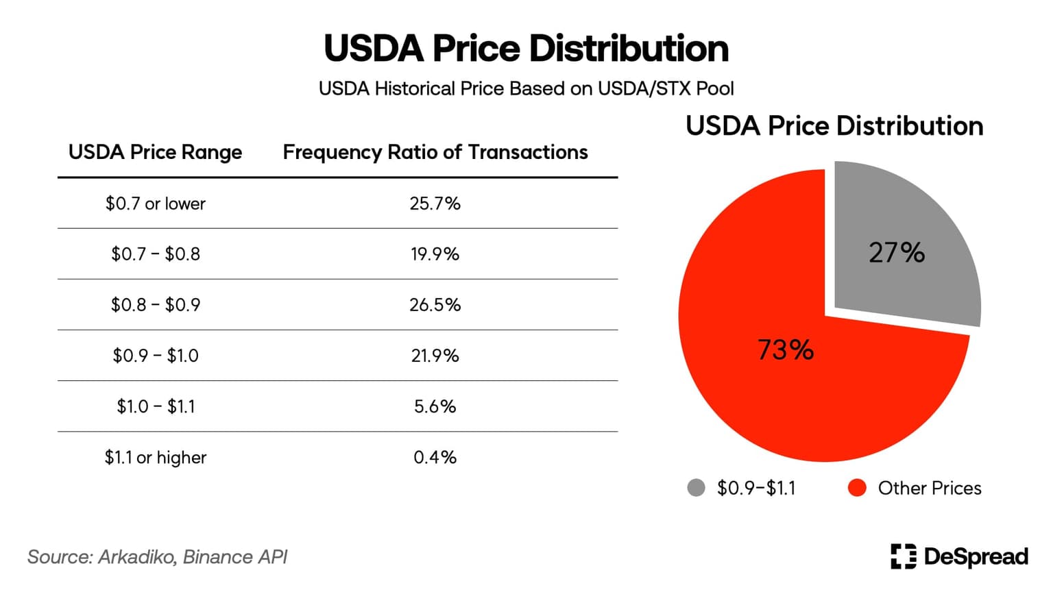 As illustrated in the Arkadiko roadmap, the primary reason for the Arkadiko 2.0 upgrade was the unstable pegging of USDA. Reviewing the USDA/STX pool transactions since Arkadiko's launch shows that over 70% of trades valued USDA below $0.9.