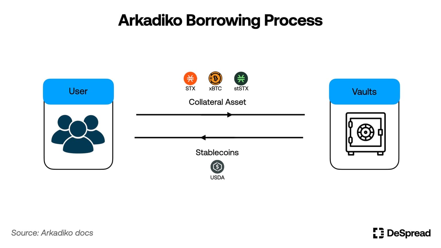 Arkadiko issues a stablecoin, USDA (USD Arkadiko), valued at $1, using Stacks-based assets like STX and stSTX as collateral. This project is based on a Collateralized Debt Position (CDP) system, allowing users to leverage their asset positions while gaining additional asset utilization opportunities. This process is similar to securing bank loans with assets like homes or cars in traditional markets, with the lending and repayment procedures conducted in a decentralized environment via smart contracts.