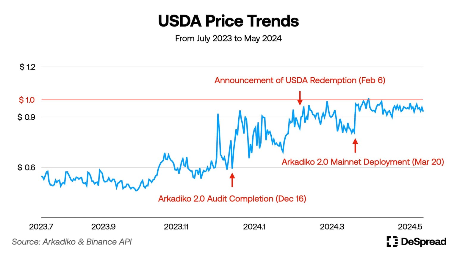 Following the announcement and mainnet deployment of Arkadiko 2.0 featuring the redemption function, USDA prices have shown signs of stabilizing closer to the $1 peg, indicating some effectiveness of the update. However, the feature currently remains accessible mainly to developers, highlighting some limitations in user accessibility.