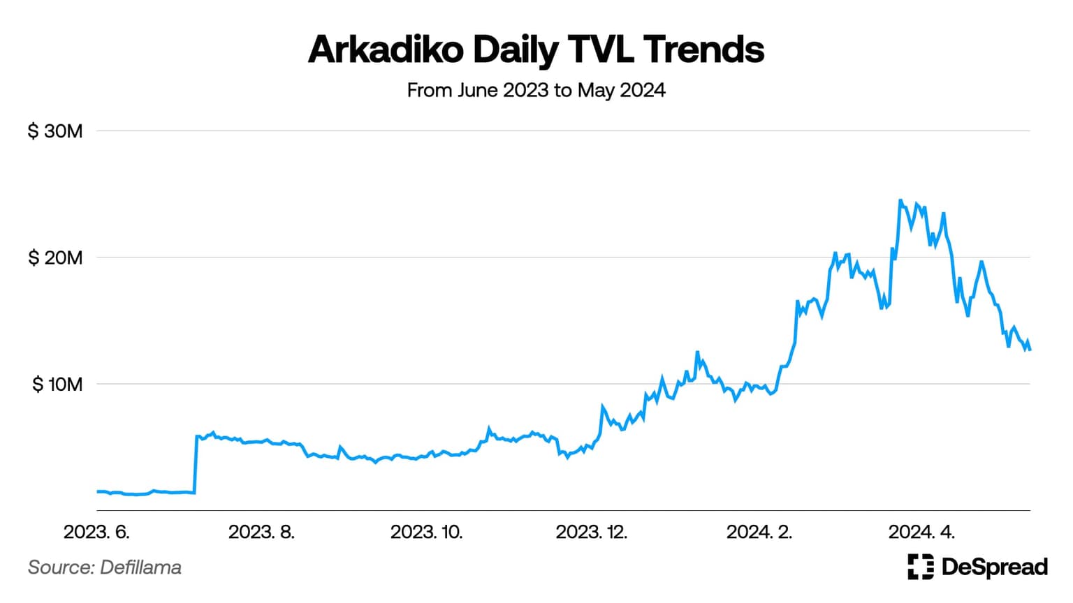 The overall market recovery spurred by the Bitcoin ETF approval became evident from mid-2023, with Bitcoin-related themes receiving significant attention. Arkadiko, a main CDP project within the Stacks ecosystem, benefited from this trend, showing remarkable growth across its protocol. From June 2023 to March 2024, Arkadiko's TVL grew approximately 19 times from 24.6M.