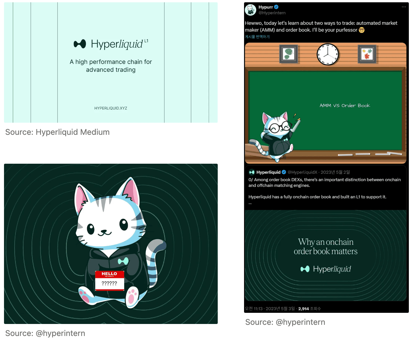 In March, they introduced referral codes for user expansion, and from April, they established their overall visual identity including branding colors and fonts through mascot marketing via the Hyperintern Twitter account. They created educational blog content to inform users about Hyperliquid and consistently produced content on the HyperIntern Twitter to increase SNS exposure.