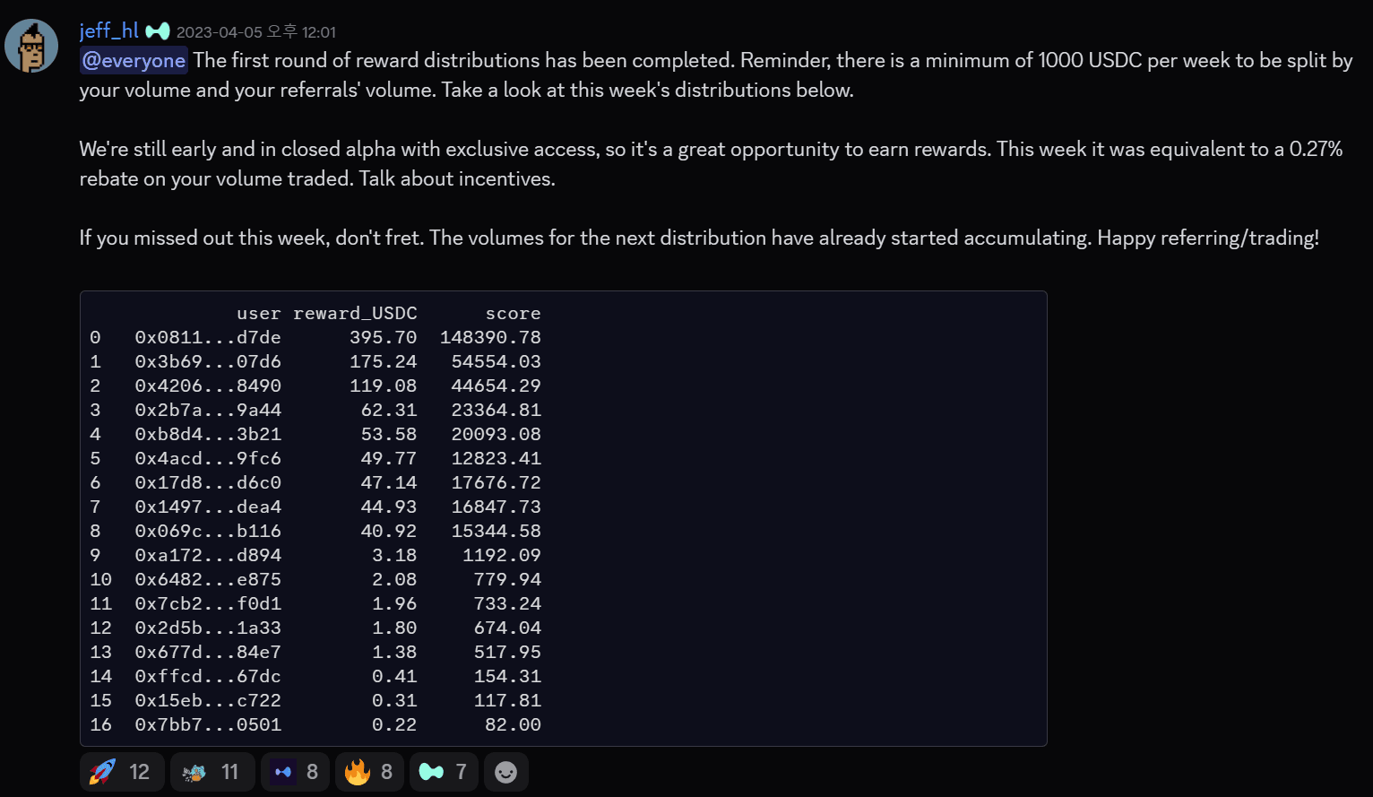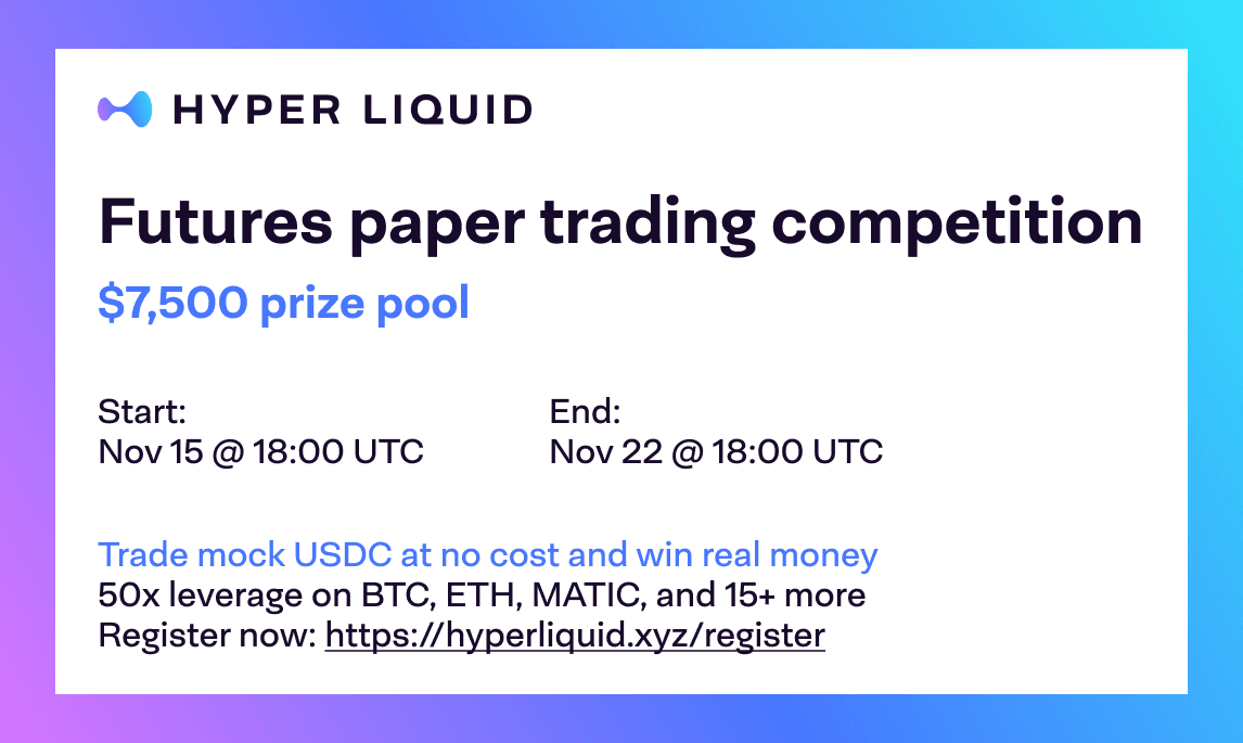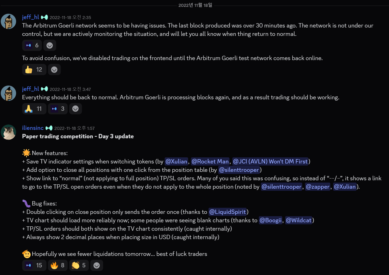 In November 2022, Hyperliquid launched the "Futures paper trading competition" event on Arbitrum Goerli testnet. From the first event, the Hyperliquid team made transparent communication with the community a core value. The team shared all event progress in real-time through Discord and honestly disclosed unexpected technical issues such as Arbitrum testnet's block generation problems.