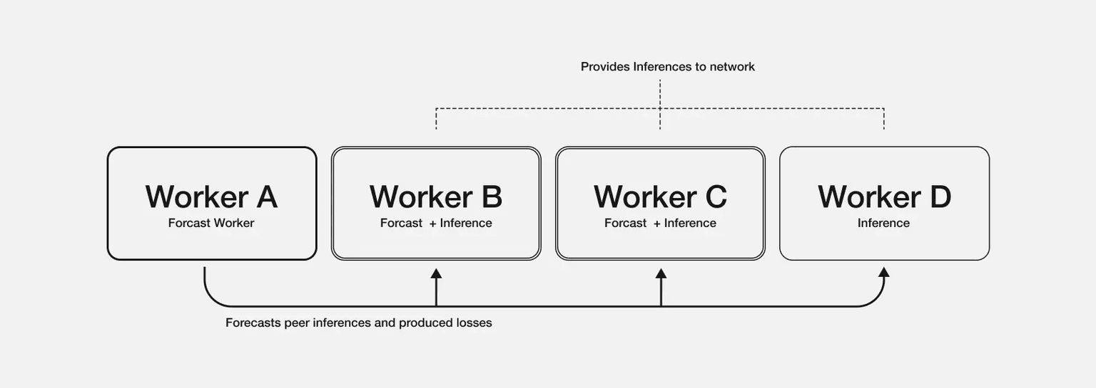 Workers in the Allora network not only submit inference values for topics requested by consumers but also evaluate the accuracy of other workers' inferences and derive Forecasted Losses based on these evaluations. These forecasted losses are reflected in weight calculations needed for inference synthesis, and workers receive higher incentives both when their inferences are accurate and when they accurately predict other workers' inference accuracy. Through this structure, Allora can derive inference synthesis weights that consider various contextual situations, not just workers' past performance.