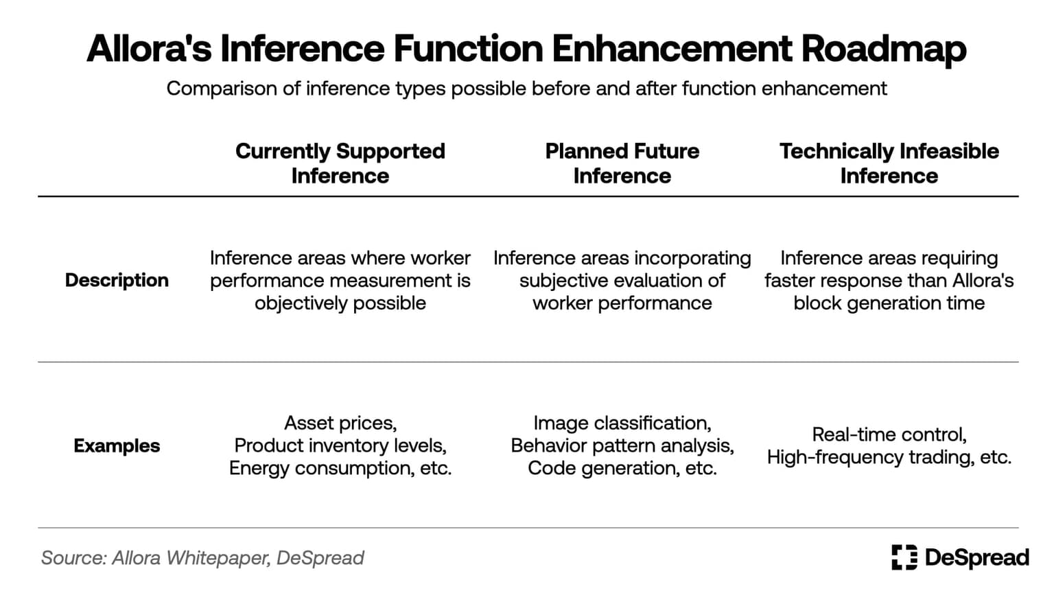 As AI technology advances and proves its utility, AI inference adoption and implementation are actively progressing across most industries. However, the resource-intensive nature of AI adoption is widening the competitive gap between large corporations that have successfully implemented AI and smaller companies that cannot. In this environment, demand for Allora's capabilities - providing topic-optimized inferences and self-improving data accuracy through decentralization - is expected to gradually increase.