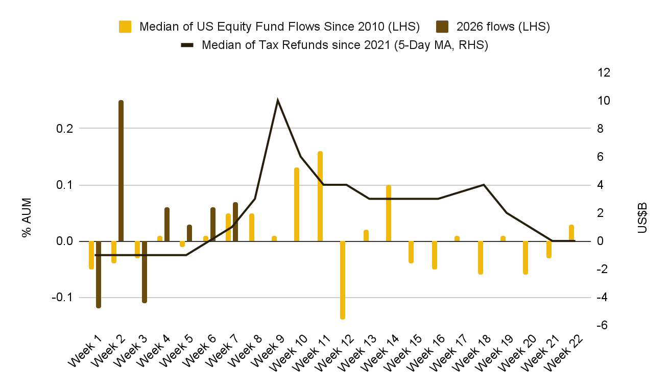 단기적으로는 하급심 법원들이 기업의 환급 청구를 우선시할 가능성이 높아, 소비자에게 직접 유동성이 공급되는 부양책 시나리오는 다소 희석될 수 있습니다. 그럼에도 불구하고 다가오는 세금 환급 시즌은 위험 자산에 추가적인 유동성을 공급하는 재정적 순풍이 될 수 있음을 간과해서는 안 됩니다.