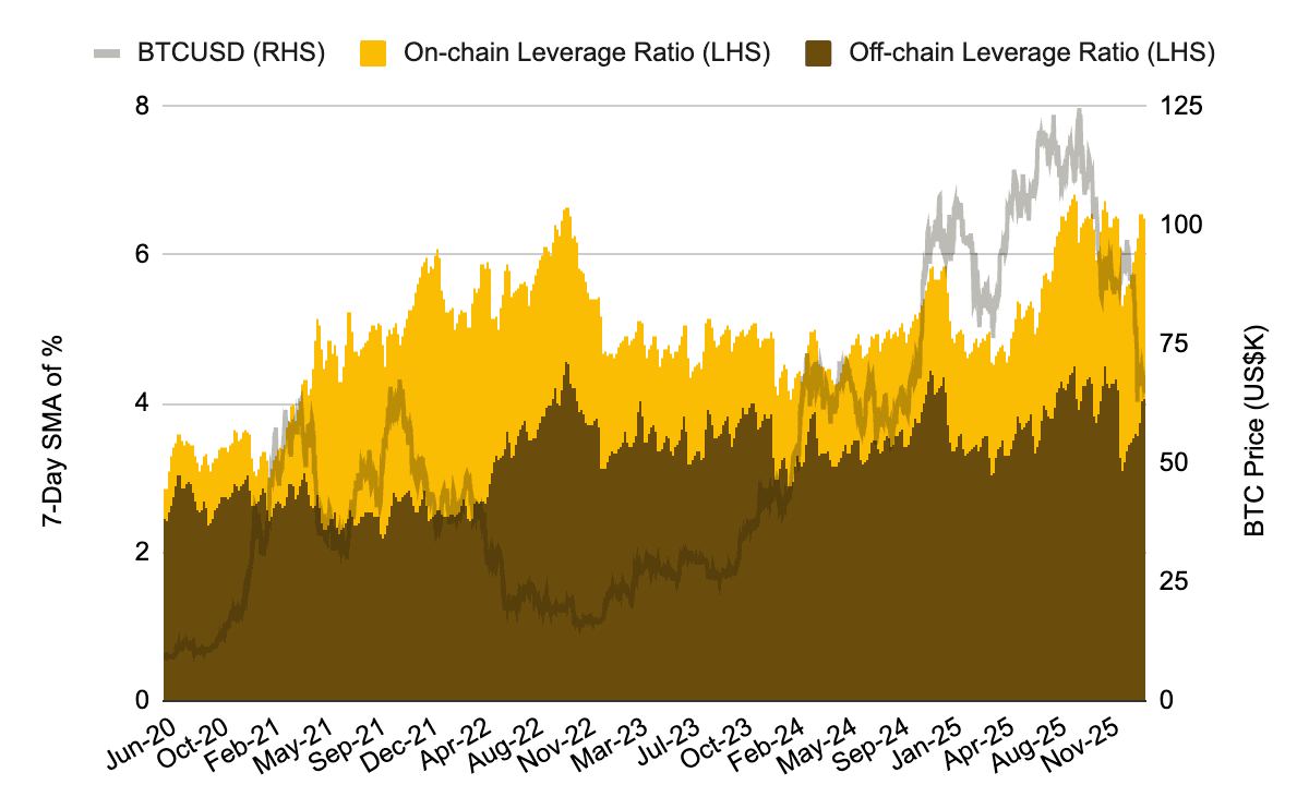 비트코인의 대출 및 파생상품 레버리지 비율이 작년 11월 이후 최고치로 돌아왔습니다. 직관에 어긋나 보이지만 이는 신규 투기 세력의 진입보다는 단기 바닥 신호에 가깝습니다. 가격이 급락할 때 시장이 레버리지를 축소하는 속도보다 자산 가격 하락 속도가 더 빠르면 레버리지 비율이 수동적으로 상승하게 됩니다. 이 극도의 스트레스 구간이 지나면 시장은 다시 안정을 찾게 됩니다.