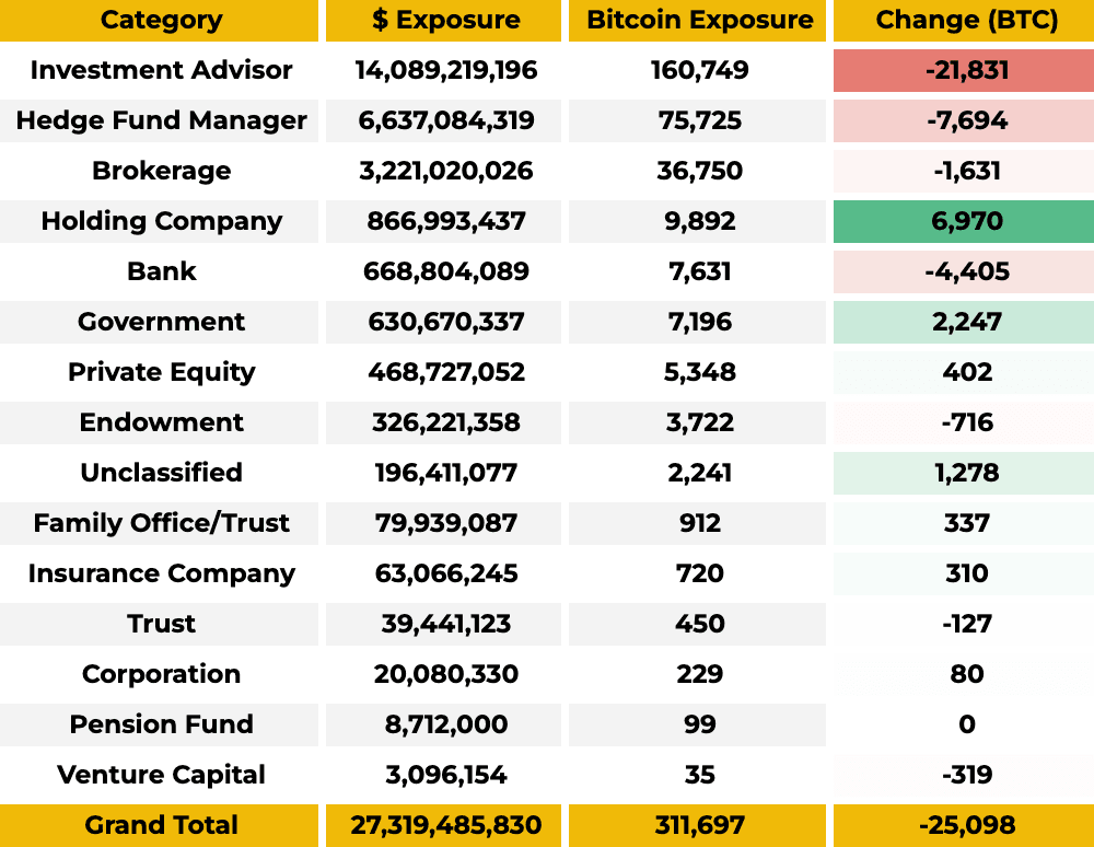 4분기 기관 보유량을 보여주는 최신 13F 공시에 따르면, ETF에서 약 25,000 BTC 규모의 기관 순유출이 발생했습니다. 하지만 투자자 범주별로 쪼개어 보면 훨씬 더 흥미롭고 긍정적인 맥락을 확인할 수 있습니다.