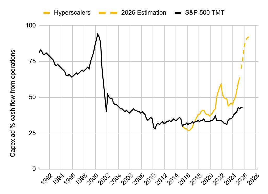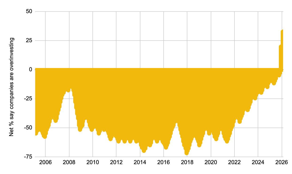 거대 기술 기업들은 2026년에만 무려 6,000억~7,000억 달러 규모의 자본 지출을 예고했습니다. 이는 기업의 영업 현금 흐름을 사실상 모두 흡수하는 수준입니다. 이러한 규모의 투자는 기업의 밸류에이션 멀티플을 압박하고 자사주 매입 여력을 떨어뜨립니다. 실제 펀드 매니저 설문조사에 따르면, 현재 기업들의 Capex를 "과도하다"고 평가하는 비율이 역사적 극단에 달해 있습니다.