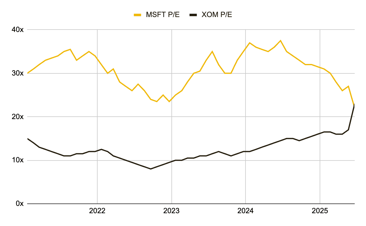 이러한 우려는 자산 가격에도 명확히 나타납니다. 마이크로소프트는 두 자릿수 매출 성장을 유지하고 있음에도 불구하고, 선행 주가수익비율이 전통 에너지 기업인 엑손모빌과 거의 비슷한 수준까지 하락했습니다. 이는 이성적인 펀더멘털 평가라기보다는 시장의 감정적인 과매도를 반영하는 것일 수 있습니다.