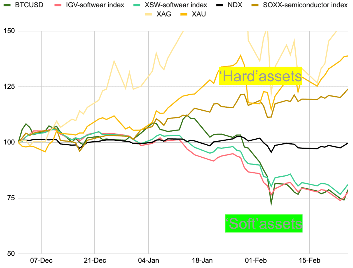 2024년 미국 비트코인 현물 ETF 승인은 비트코인의 소유 구조를 근본적으로 바꿨습니다. 소프트웨어 주식을 보유한 기관들이 이제 BTC도 함께 보유합니다. 그들의 리스크 관리 시스템은 두 자산을 같은 '고변동성 기술주' 그룹으로 묶습니다. AI 잠식 우려로 소프트웨어 주식을 대거 매도할 때, 비트코인 역시 화폐적 성격이 변해서가 아니라 '누가 들고 있는가'에 의해 함께 매도된 것입니다.