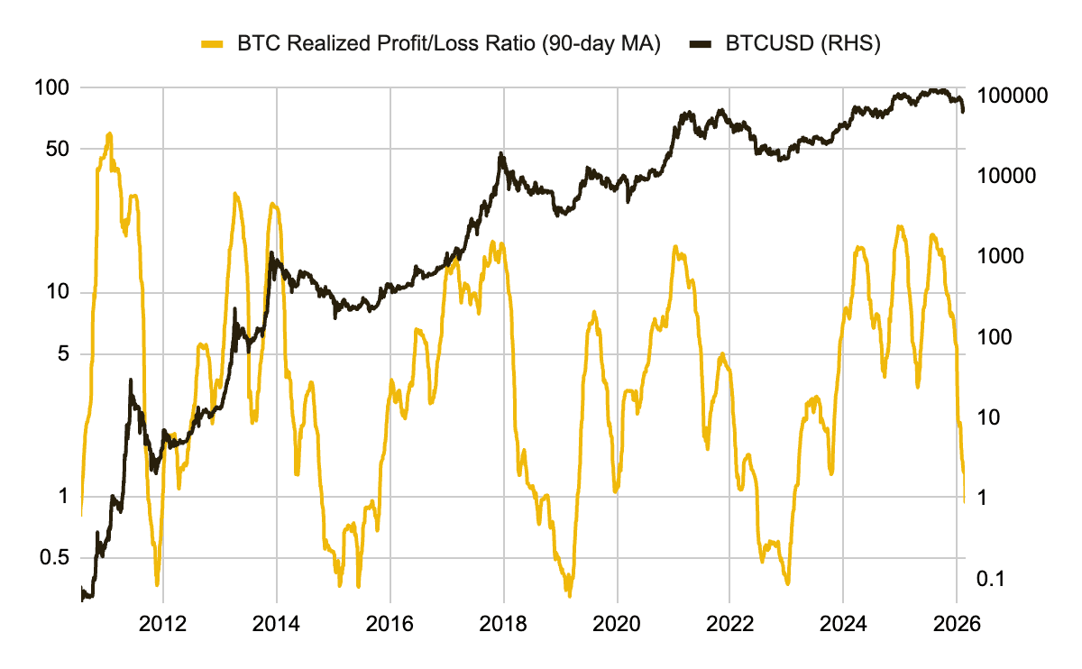비트코인 실현 손익 비율(90일 이동평균)이 2023년 이후 처음으로 1.0 아래로 떨어졌습니다. 이는 투자자들이 광범위하게 손실을 확정 짓는 항복 단계에 진입했음을 의미합니다. 역사적으로 이 임계점 아래로 떨어진 이후 매도세가 소진되면, 시장은 다음 상승장을 위한 유동성 재구축 단계에 돌입하곤 했습니다.
