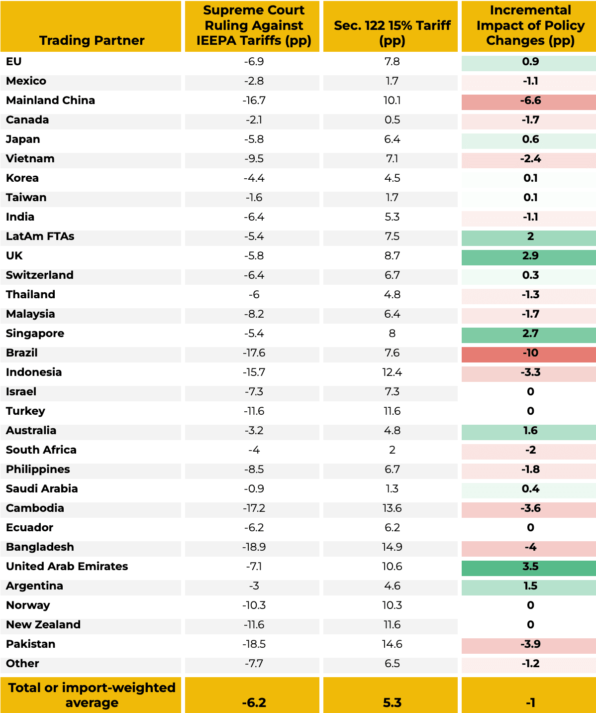 하지만 시장은 초기에 이 조치의 순영향을 잘못 가격에 반영한 것으로 보입니다. 122조는 기존 IEEPA 체제 위에 누적되는 것이 아니라 이를 대체하는 것이기 때문에, 전체 실효 관세율은 10%대에서 약 9%로 1%포인트가량 하락할 것으로 추정됩니다.