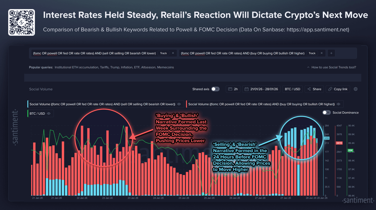 🔖 Monitor how FOMC mentions skew bullish or bearish across social media with this handy Santiment chart!